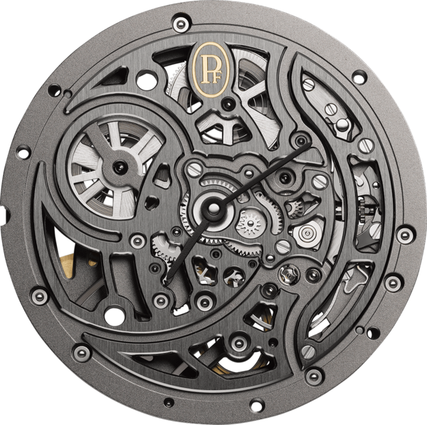 Les artisans ont su tirer parti des pleins et composer avec les vides pour faire entrer la lumière au cœur même du calibre PF 777. Ce délicat treillage méticuleusement anglé à la main, entraîne l’œil des puristes à plonger au cœur même de la mécanique afin d’appréhender une part des mystères de sa cinématique.