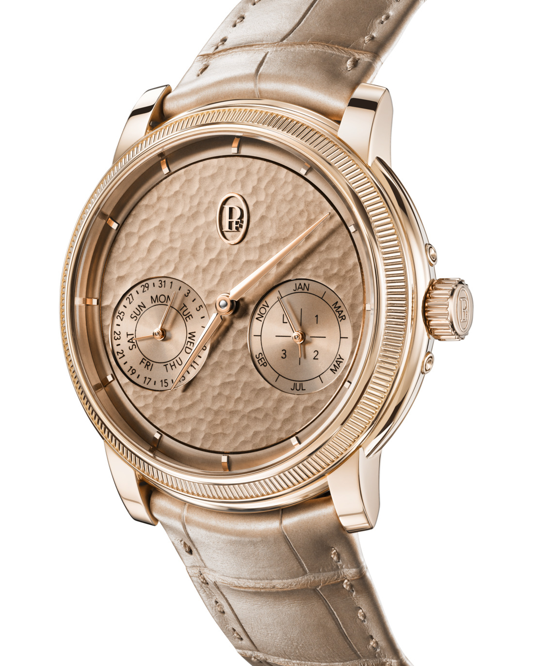 A perpetual calendar expressed with composure rather than display. The dial, crafted in hand-hammered 18-carat rose gold, reveals a living, tactile surface, where light is caught, softened and continuously transformed by the rhythm of each artisan’s gesture. It concentrates the indications across two coaxial sub-dials, preserving legibility and the purity of the composition.