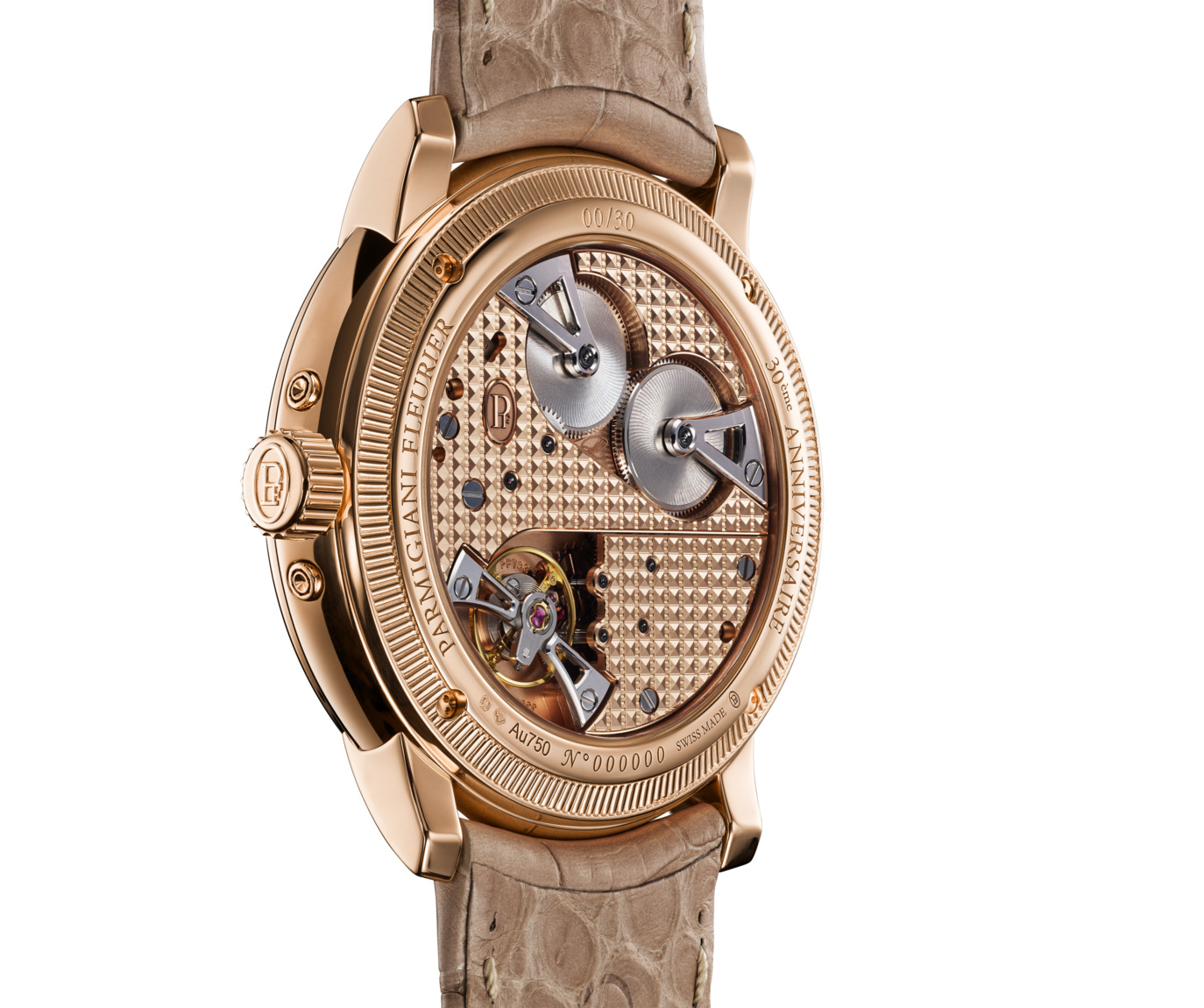 The precious-metal case, defined by the Toric knurled bezel, echoed by a similarly knurled case back, frames the complication with discretion. Inside, a hand-wound manufacture calibre built around solid 18-carat rose-gold bridges translates mechanical complexity into order and clarity.
