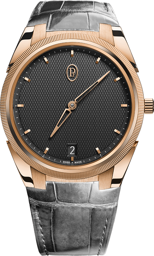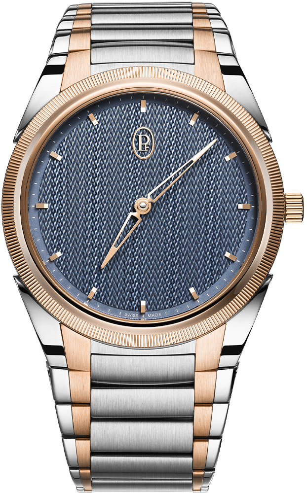 أما الإطار المحزّز بدقّة فيشكّل مقابلاً حسّياً ملموساً، فيما تُكمل المؤشرات المطبّقة والميدالية الصغيرة PF على التاج لغة بصرية منسجمة.
