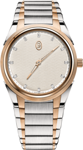 全体が18Kピンクゴールド製のトンダ PF オートマティック 36mm。特徴づけるのは、パルミジャーニ・フルリエを象徴する「ウォームグレー」カラーが全体との繊細なコントラストを生む、手彫りギョーシェ仕上げのダイヤルです。ダークな色合いは、インビジブルセッティングのバゲットカットダイヤモンドのアワーマーカーを際立たせ、ベゼルに配したブリリアントカットダイヤモンドを控えめに引き立てて、複雑なローレット加工を強調します。